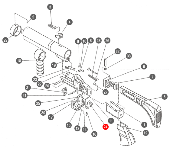 22 Empty shell ejection lever 23 Empty shell ejection spring 24 Firing pin hammer (outside)